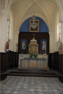 Un petit clocher a été élevé au-dessus de la sacristie, située au sud du chœur. Le chœur est voûté d’ogives, mais les chapiteaux se sont perdus, et les nervures retombent sur de simples consoles. Par contre, au nord de l’arc triomphal, devant les murs et dans les angles occidentaux de la nef, subsistent des faisceaux de trois colonnettes avec de remarquables chapiteaux. Ceux de l’arc triomphal dateraient du XII s et représentent des personnages ; les autres sont sculptés en feuillages, mais semblent en partie refaits. Plus aucune fenêtre n’est d’origine. La nef est seulement éclairée par deux baies au remplace Renaissance dans la façade nord,.7,8